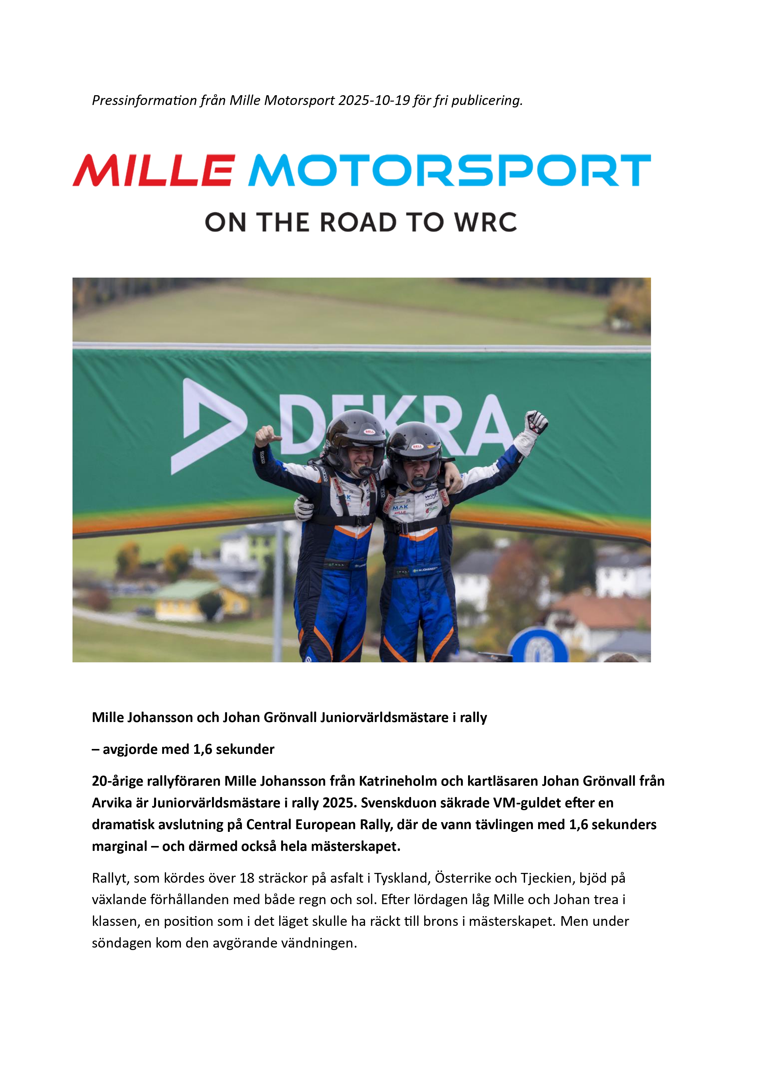 20-årige Mille Johansson från Katrineholm och kartläsaren Johan Grönvall från Arvika är världsmästare i Junior WRC 2025. Svenskduon säkrade mästerskapstiteln efter en osannolik avslutning på Central European Rally, där de vann med endast 1,6 sekunders marginal – och därmed skrev svensk rallyhistoria.
