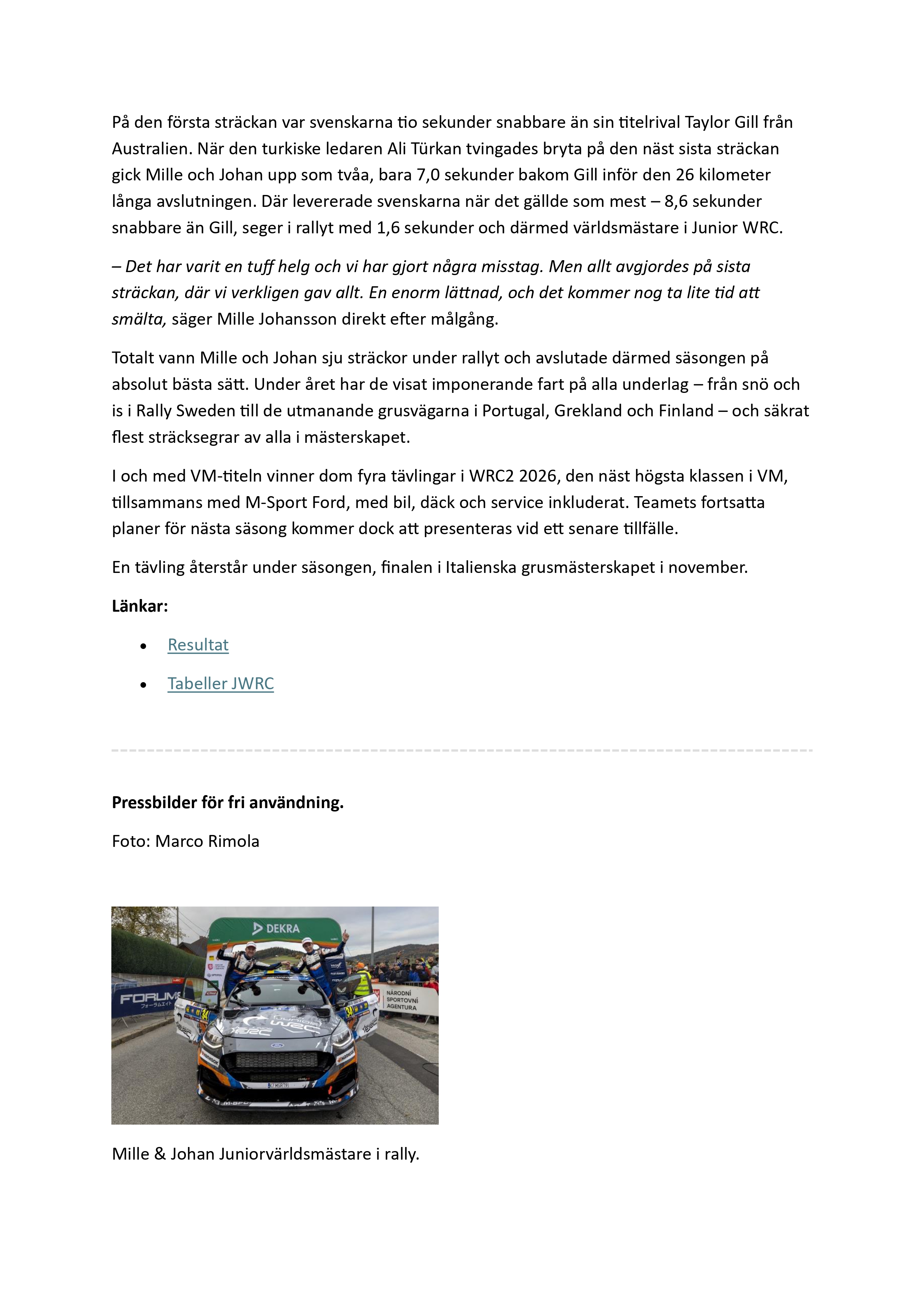 I och med VM-titeln belönas de med fyra tävlingar i WRC2 2026, den näst högsta klassen i rally-VM, tillsammans med M-Sport Ford – inklusive bil, däck och full service. Teamets planer för nästa säsong presenteras vid ett senare tillfälle.