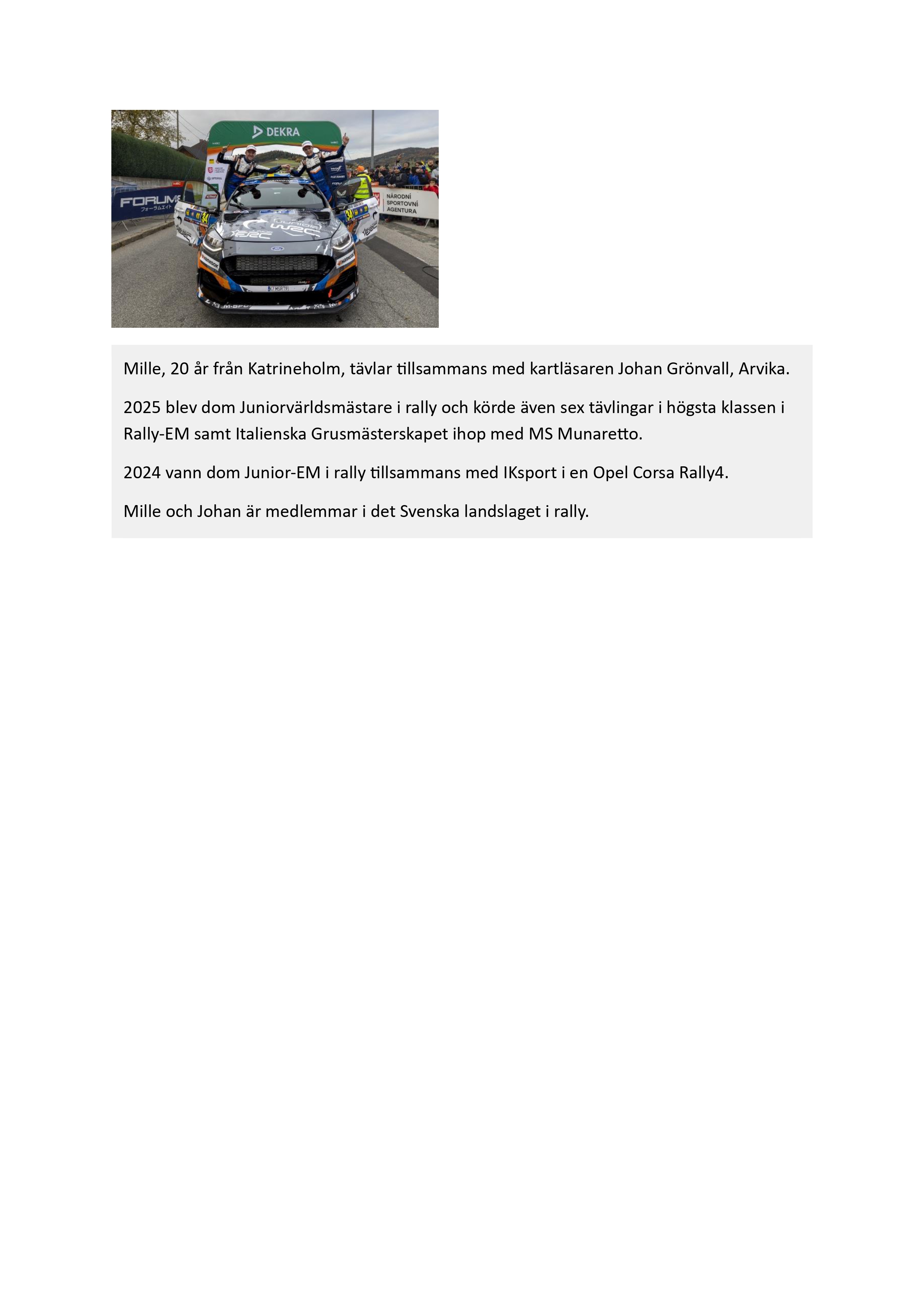 Mille Johansson, Junior WRC 2025, Juniorvärldsmästare i rally, Mille Motorsport, svensk rallyförare, rally Sverige, rally VM, WRC2, M-Sport Ford