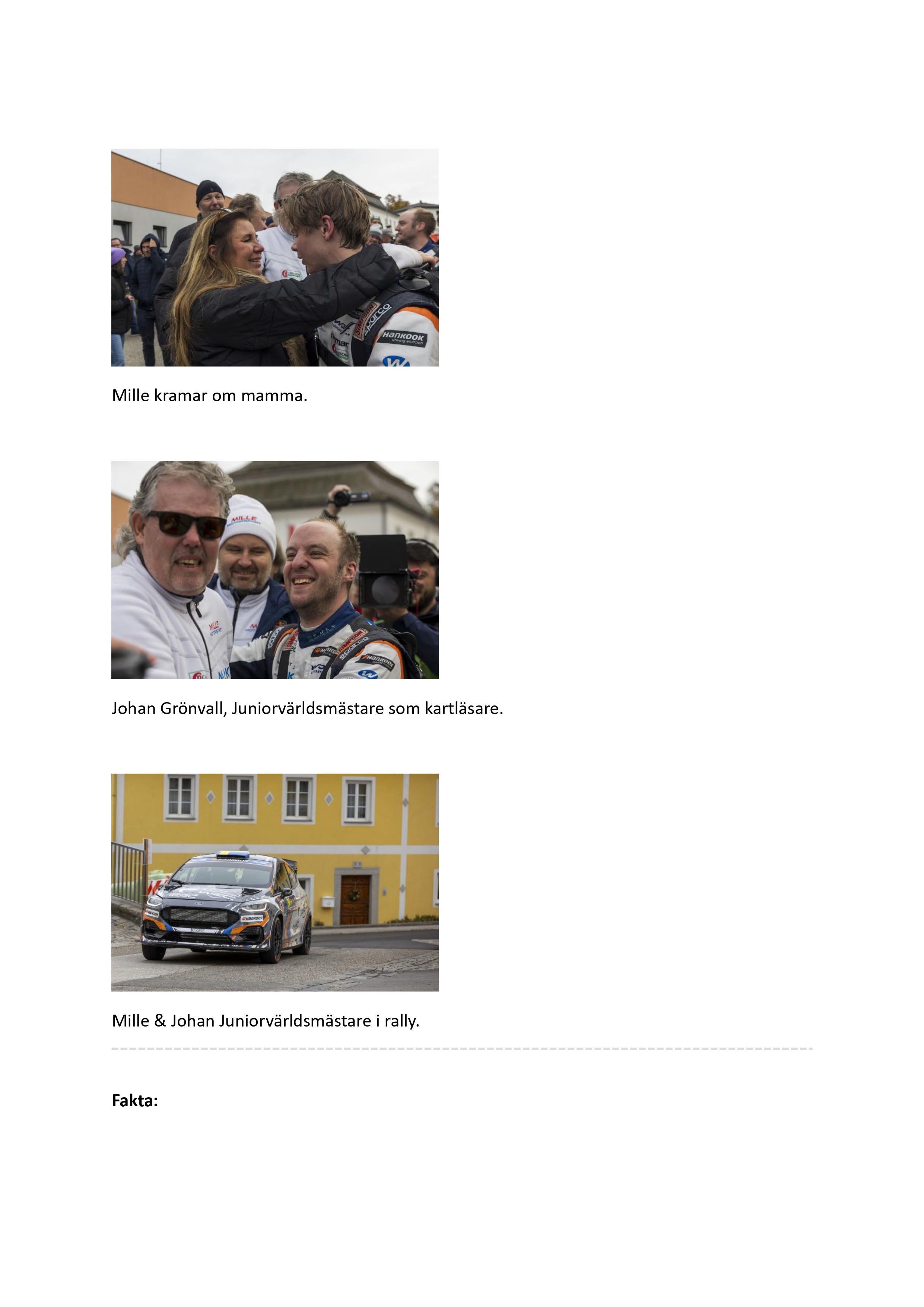 Under årets säsong har Mille och Johan visat imponerande fart på alla underlag – från snö och is i Rally Sweden till grusvägarna i Portugal, Grekland och Finland. Med flest sträcksegrar av alla i mästerskapet bevisade de att de är kompletta förare på den internationella rallyscenen.