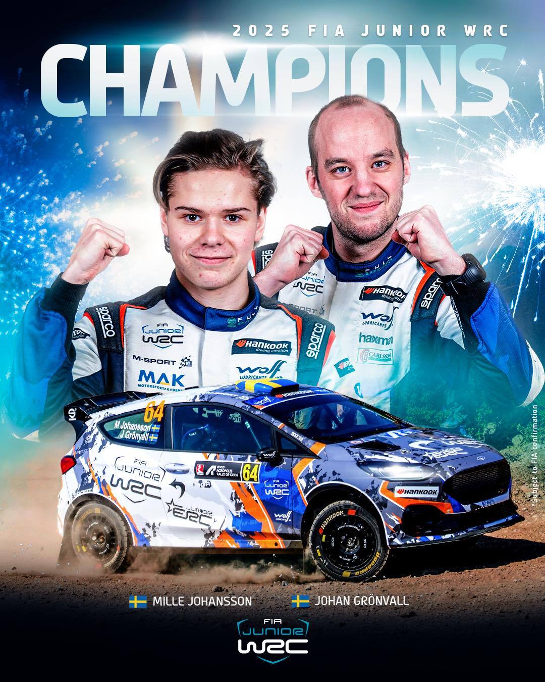 Juniorvärldsmästaren Mille Johansson klar för WRC2-satsning 2026 | Den svenska rallyföraren Mille Johansson, 20, från Katrineholm och kartläsaren Johan Grönvall från Arvika säkrade förra året titeln i Junior-VM efter en dramatisk final under Central European Rally, som avgjordes med sekunddrama på sista sträckan. Efter mästerskapstriumfen tar den svenska duon nu nästa stora steg i karriären genom en satsning på WRC2-mästerskapet 2026. Efter en mycket framgångsrik juniorkarriär kliver Mille Johansson och Johan Grönvall upp till en full säsong i Rally2-klassen 2026, när dom tar klivet in i den näst högsta VM-klassen WRC2. Som pris för segern i FIA Junior WRC ansluter den svenska duon till M-Sport Ford World Rally Team, med ytterligare stöd från däcktillverkaren Hankook.