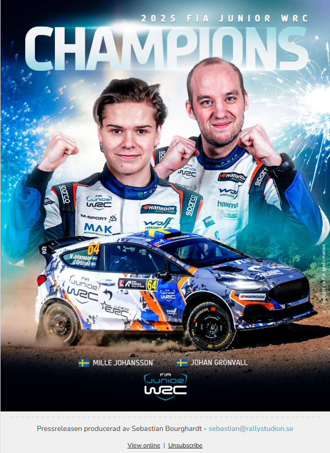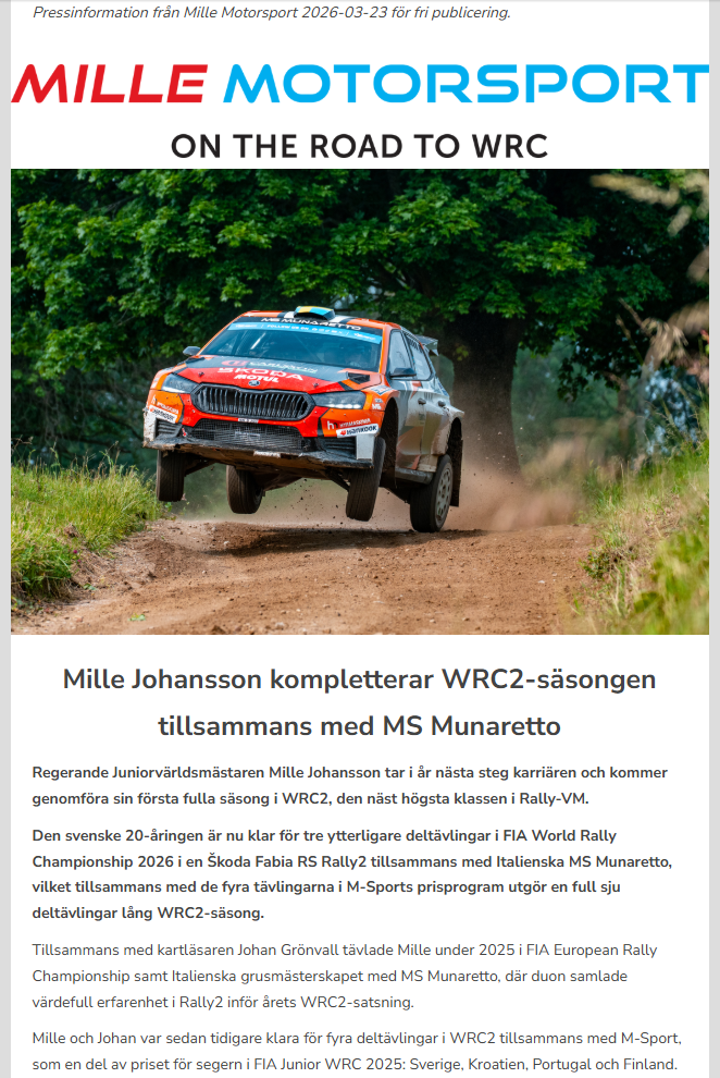 Den regerande juniorvärldsmästaren Mille Johansson tar nu nästa stora kliv i karriären. Tillsammans med det italienska teamet MS Munaretto står det nu klart att den 20-årige talangen från Katrineholm kommer att genomföra en full säsong i WRC2, den näst högsta klassen i rally-VM.