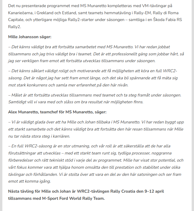 Målet för säsongen är tydligt: att etablera sig i världstoppen, samla rutin på högsta nivå och utmana om pallplatser när möjligheten ges. Teamchef Alex Munaretto betonar vikten av stabilitet och rätt tekniskt stöd för att Mille ska kunna omsätta sin stora potential till resultat i den tuffa WRC2-konkurrensen.