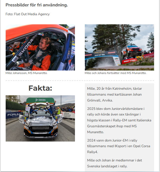 Mille Johansson och kartläsaren Johan Grönvall är inga främlingar för MS Munaretto. Under 2025 tävlade duon framgångsrikt i både Rally-EM (ERC) och det italienska grusmästerskapet tillsammans med teamet. Denna erfarenhet blir nu guld värd när motståndet skruvas upp i världsmästerskapet.