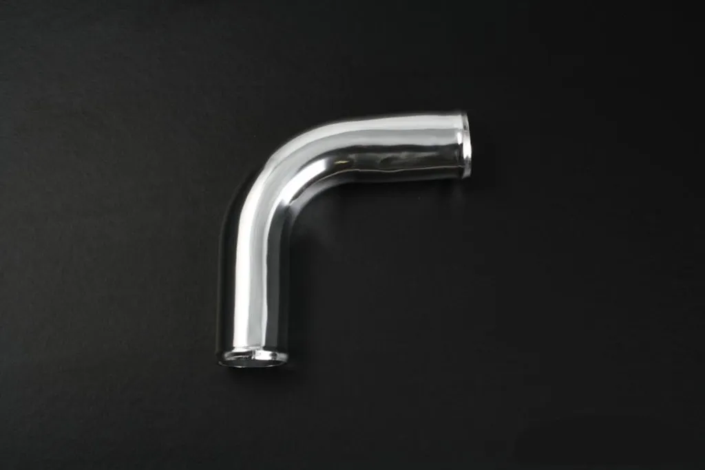 Högglanspolerat aluminiumrör i T6063 med 90-graders böj – starkt, lätt och idealiskt för prestandabyggen.