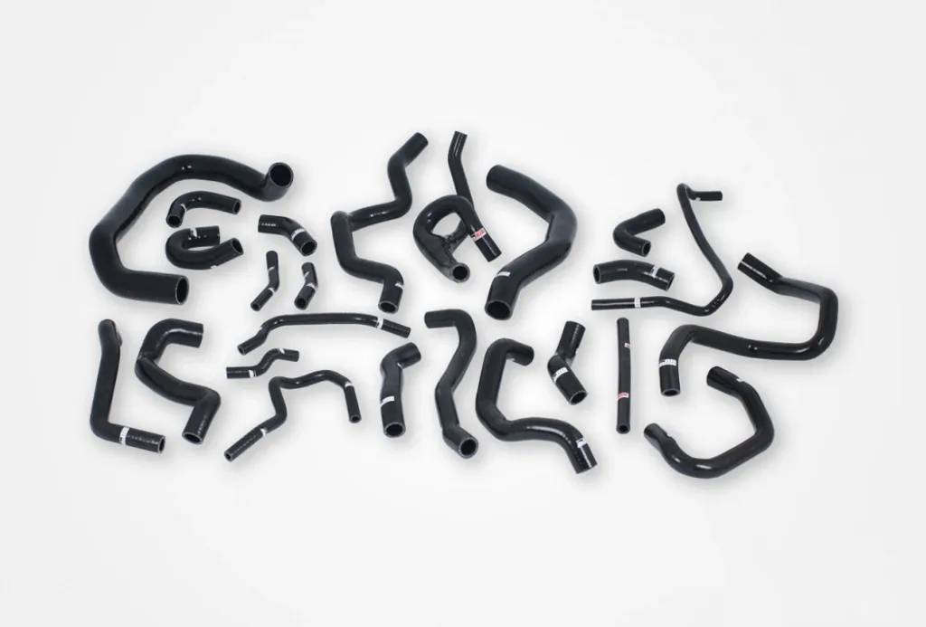 Slangarna är tillverkade i högkvalitativt silikon med tre till fem lager textilarmering beroende på innerdiametern. Konstruktionen säkerställer extrem tålighet mot tryck, värme och åldrande. Originalslangar i gummi spricker ofta efter lång användning – detta kit erbjuder en permanent och prestandaförbättrande lösning för både gat- och banbilar.