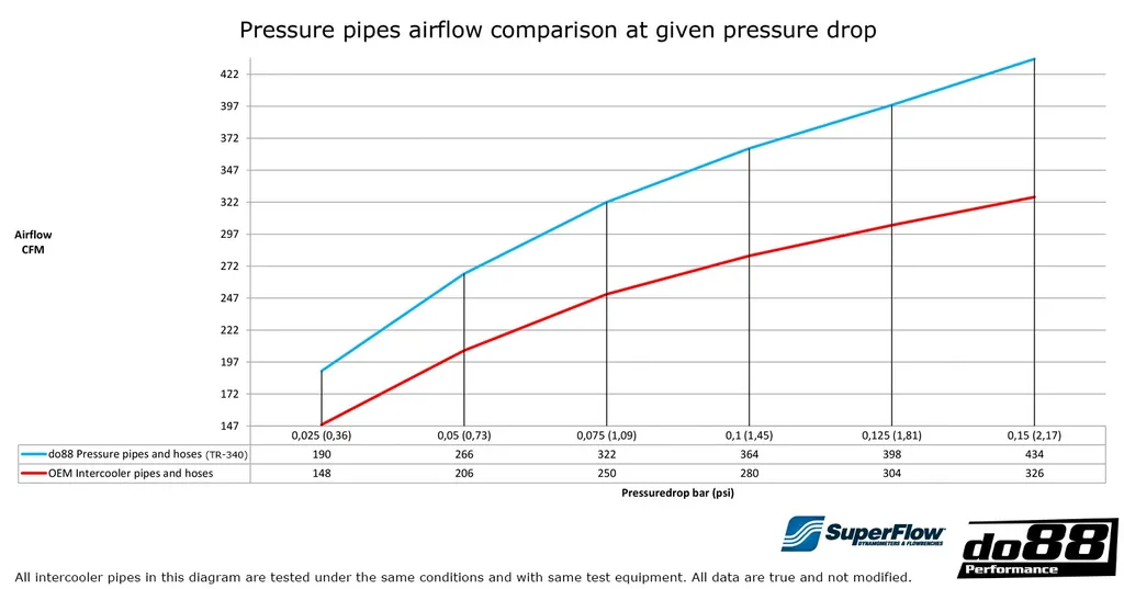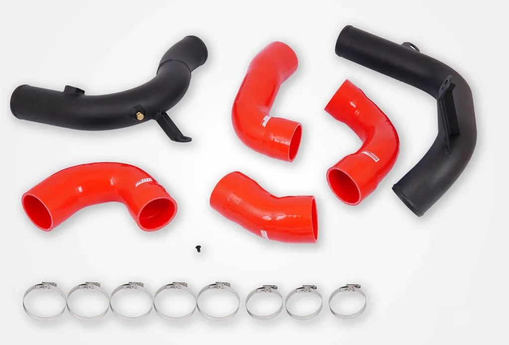 Detta tryckrörspaket är framtaget för att ersätta det restriktiva originalröret. Det ger hela 30 % högre luftflöde vid samma tryckfall och är testat både i bil och i flödesbänk. Röret är tillverkat i 63 mm (2,5”) extruderat aluminium, dornbockat för perfekt passform och utrustat med uttag för metanolinsprutning (1/8–27 NPT) – plugg medföljer om de inte används. Den medföljande röda silikonslangen har 4 lager polyester-/aramidarmering och är byggd för att tåla både höga temperaturer och tryck.