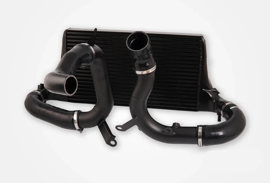Intercoolern är tillverkad helt i aluminium och använder CAD-designade, flödesoptimerade tankar och ett specialanpassat cellpaket för högsta möjliga kyleffekt. Tryckrörssystemet består av 2,5” extruderade och dornbockade aluminiumrör i kombination med flerlagers silikonslangar som klarar höga temperaturer och tryck. Paketet ersätter hela sträckan mellan turbon och spjällhuset och ger ett betydligt bättre tryckförhållande och stabilare laddluftstemperatur än originalsystemet.