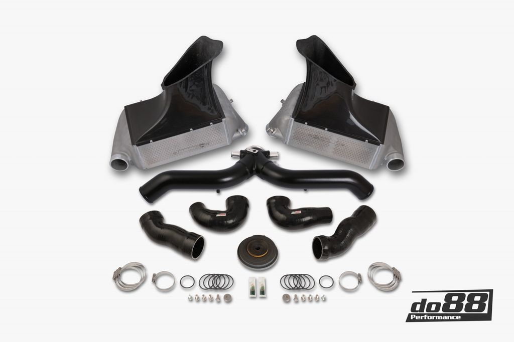 Systemet kombinerar två högkapacitets intercoolers i aluminium med ett flödesoptimerat Y-rör i 70 mm rördimension. Konstruktionen minskar mottryck, sänker inloppstemperaturen och ger ett markant förbättrat luftflöde till motorn. De flödesverifierade gjutna tankarna och motorsportinspirerade cellpaketen ger hög värmeöverföring och lågt tryckfall. Kolfiberluftstyrningarna säkerställer effektiv luftfördelning och perfekt passform. Samtliga silikonslangar är förstärkta och värmetåliga för lång livslängd även vid högt laddtryck.