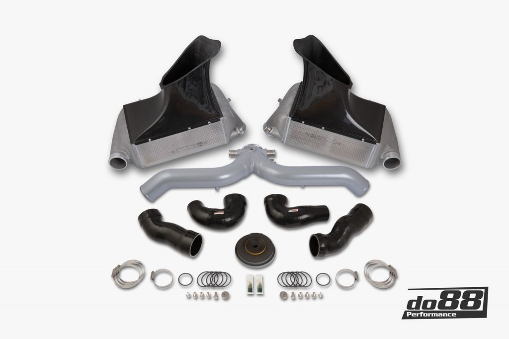 Satsen kombinerar dubbla högprestanda intercoolers i aluminium med ett Y-rör i 70 mm dornbockat aluminium och specialdesignade silikonslangar. Resultatet är ett system som ger 37 % högre luftflöde och upp till 18 °C lägre inloppstemperatur jämfört med original. Tack vare flödesoptimerade gjutna tankar och kolfiberluftstyrningar säkerställs effektiv kylning och minimalt tryckfall även vid högt laddtryck.