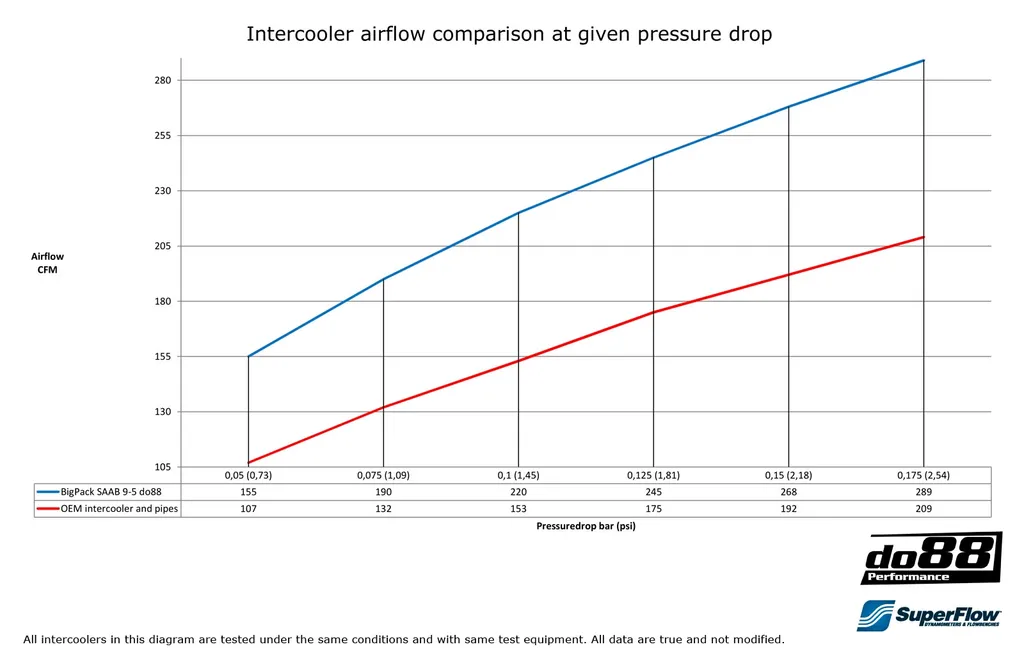 Detta diagram visar luftflöde vid olika tryckfall för do88 BIGPACK jämfört med originalintercoolern samt tryckrör*: