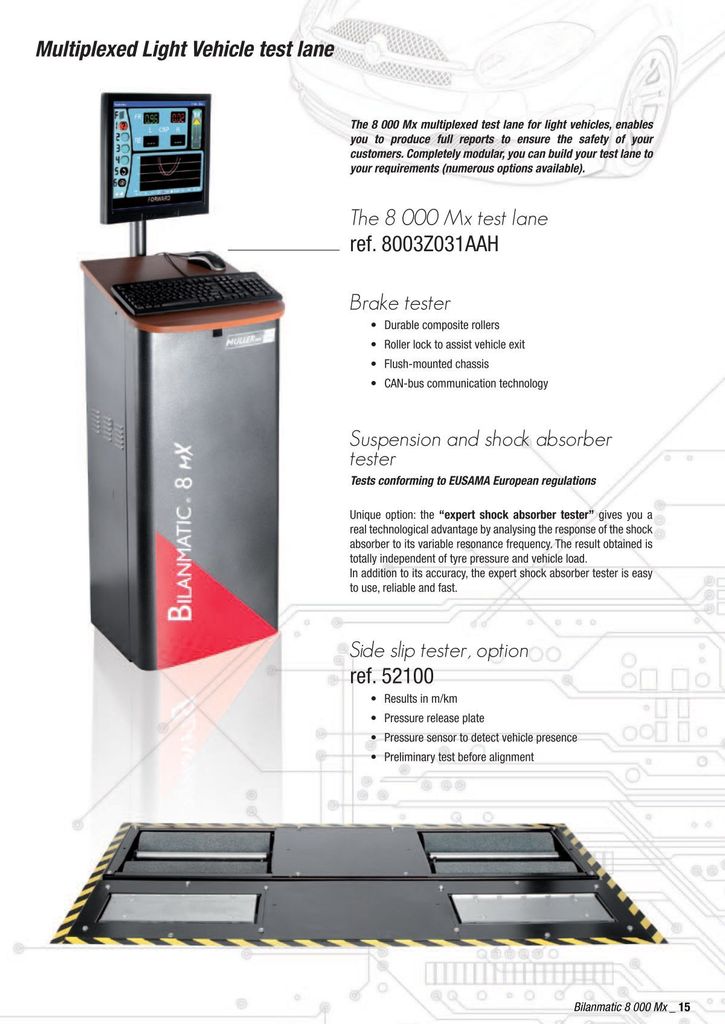 Bilnamatic 8 MX är en komplett broms- och stötdämparprovare som även kan användas för grov hjulinställning. Utrustningen är avsedd för verkstäder som behöver tillförlitliga och repeterbara testresultat för bromskraft, dämparverkan och grundläggande chassikontroll.