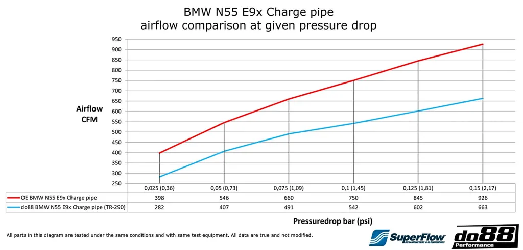 Detta tryckrör erbjuder ett avsevärt förbättrat luftflöde jämfört med originalsystemet, verifierat både i bil och i flödesbänk (SuperFlow SF-1020). Konstruktionen ger stabilitet även vid höga tryck och temperaturer, vilket gör det perfekt för fordon med uppgraderad mjukvara, chiptrimning eller annan effektoptimering.