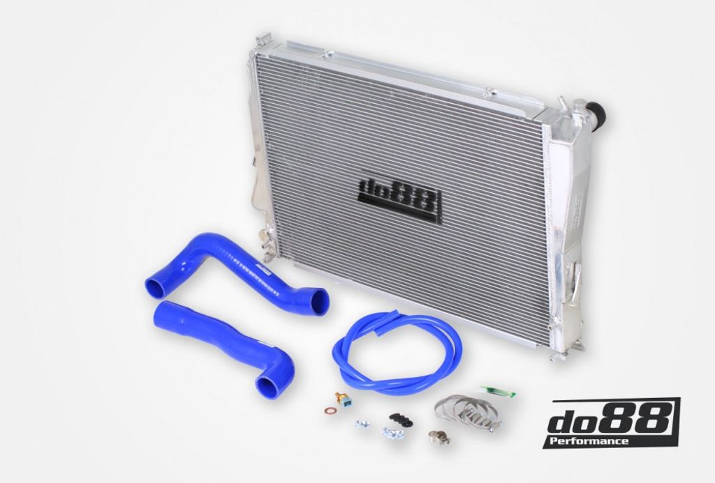 bmw m3 e46 vattenkylare blå slang, aluminium kylare bmw e46, bmw m3 e46 racing radiator, bmw m3 e46 prestandakylare trendab