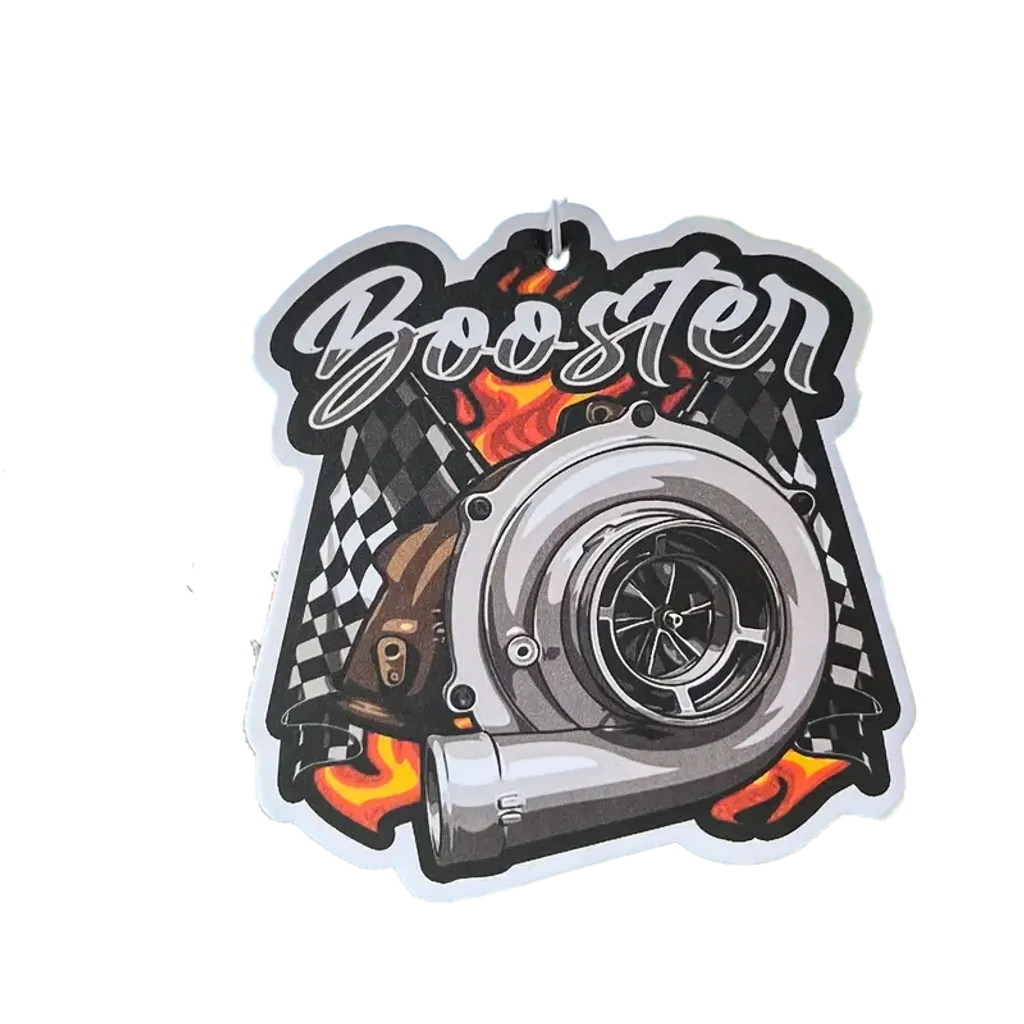 Med sin turbo, rutflaggor och eldsflammor ger denna luftfräschare tydliga motorsportvibbar. Den silvriga, cursiva ”Booster”-texten gör den till en självsäker accessoar som uppskattas av tuningentusiaster och bilintresserade världen över.