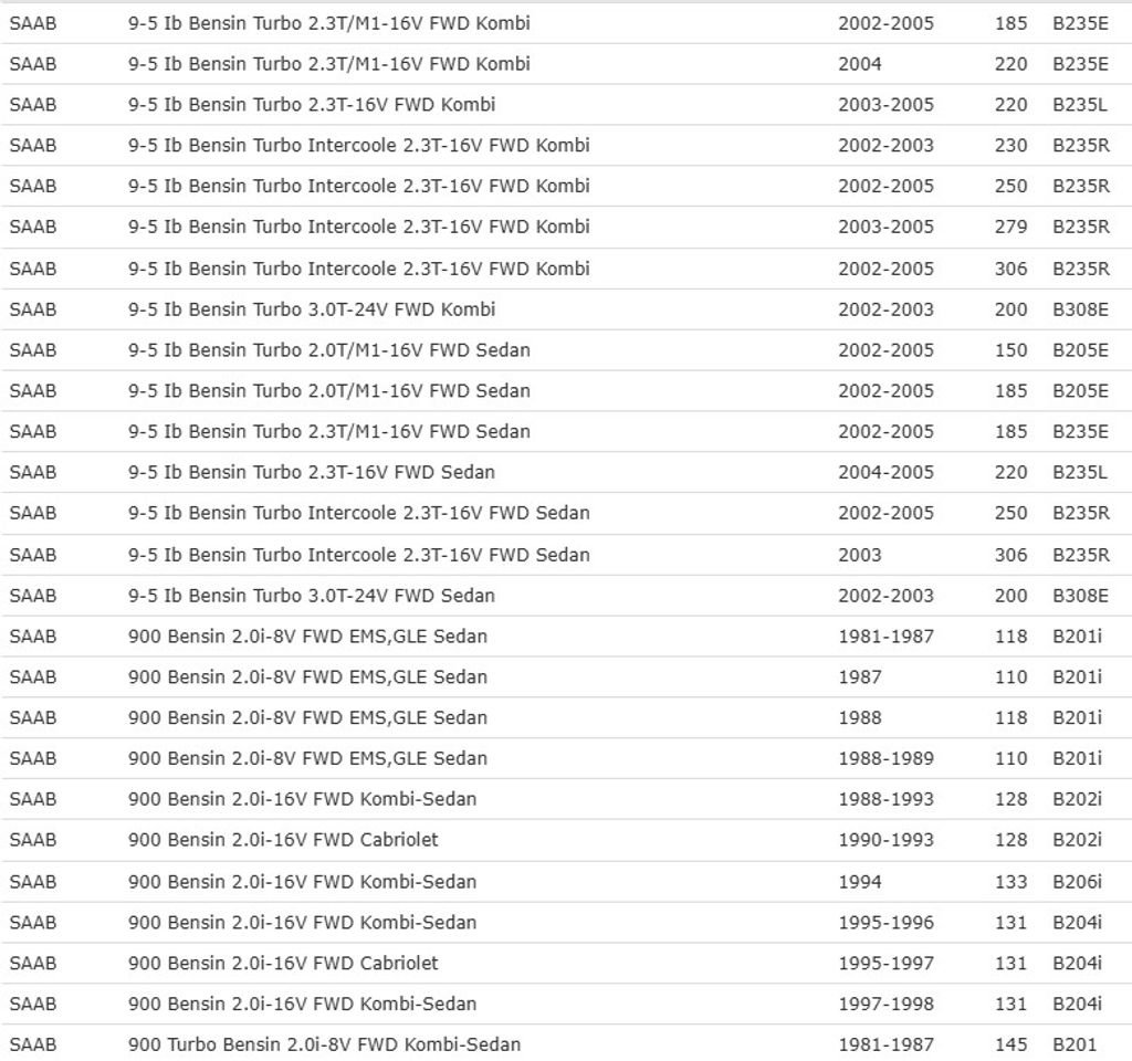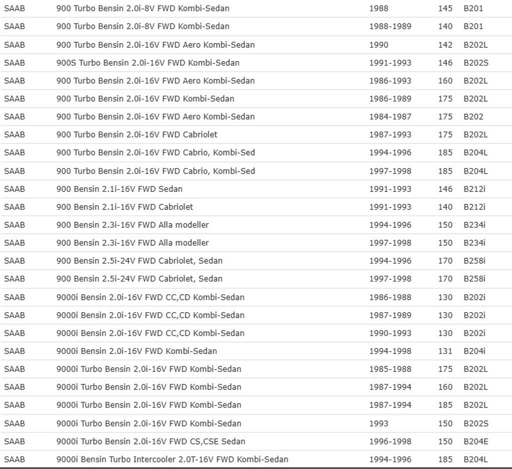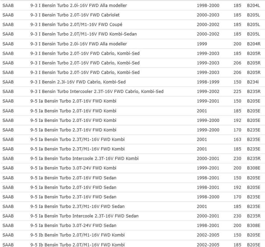 | 9-3 I 2.0/2.3 | Bensin | 98–03 |