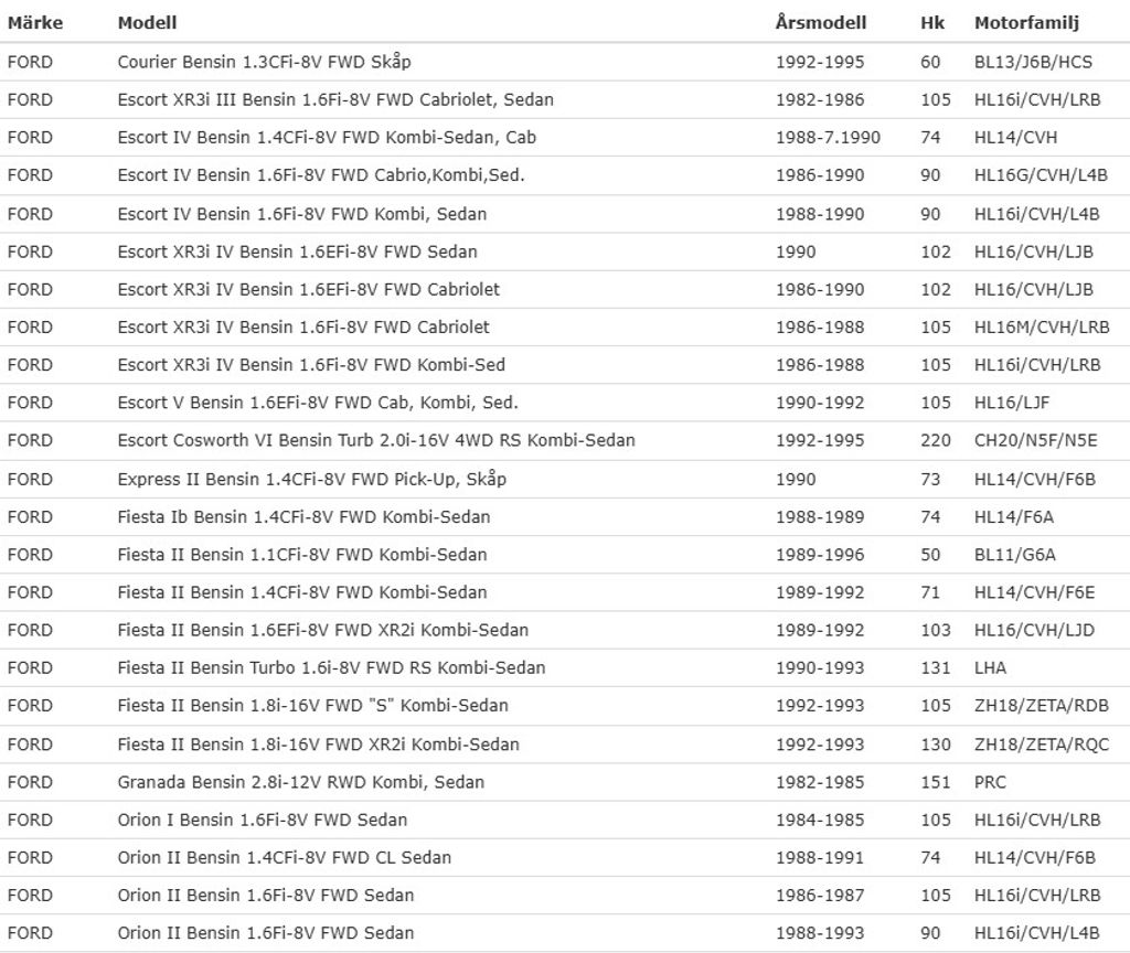 | Escort IV 1.6Fi-8V | Bensin | 86–90 |
