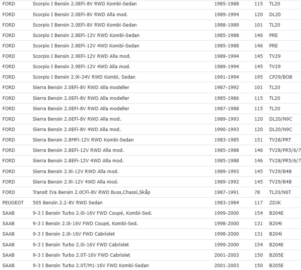 | Fiesta II 1.1/1.4/1.6/1.8 | Bensin | 89–96 |