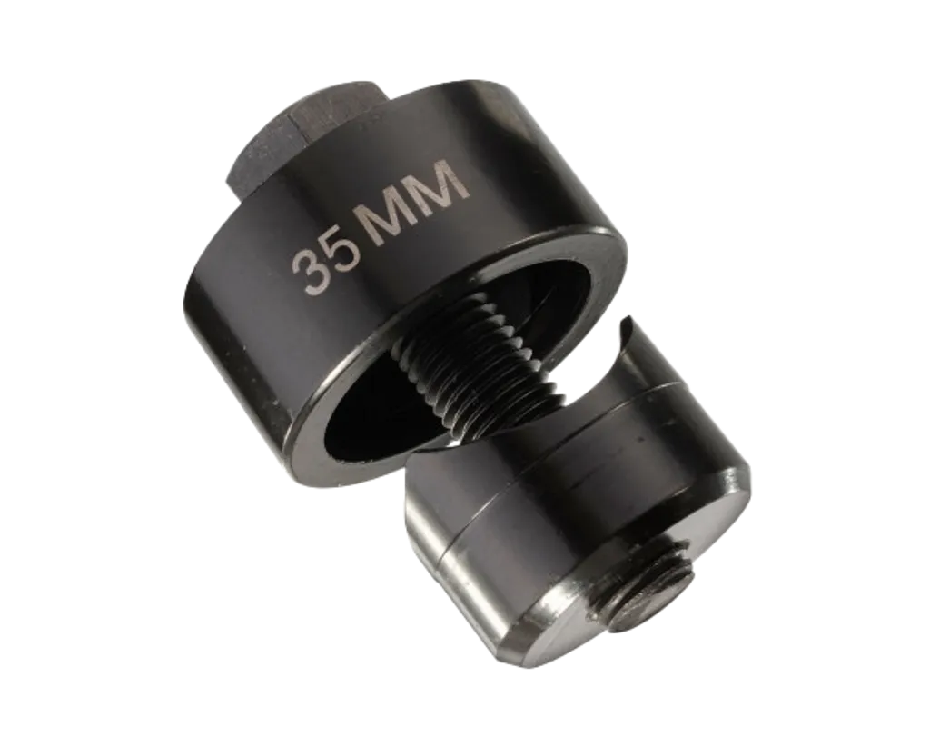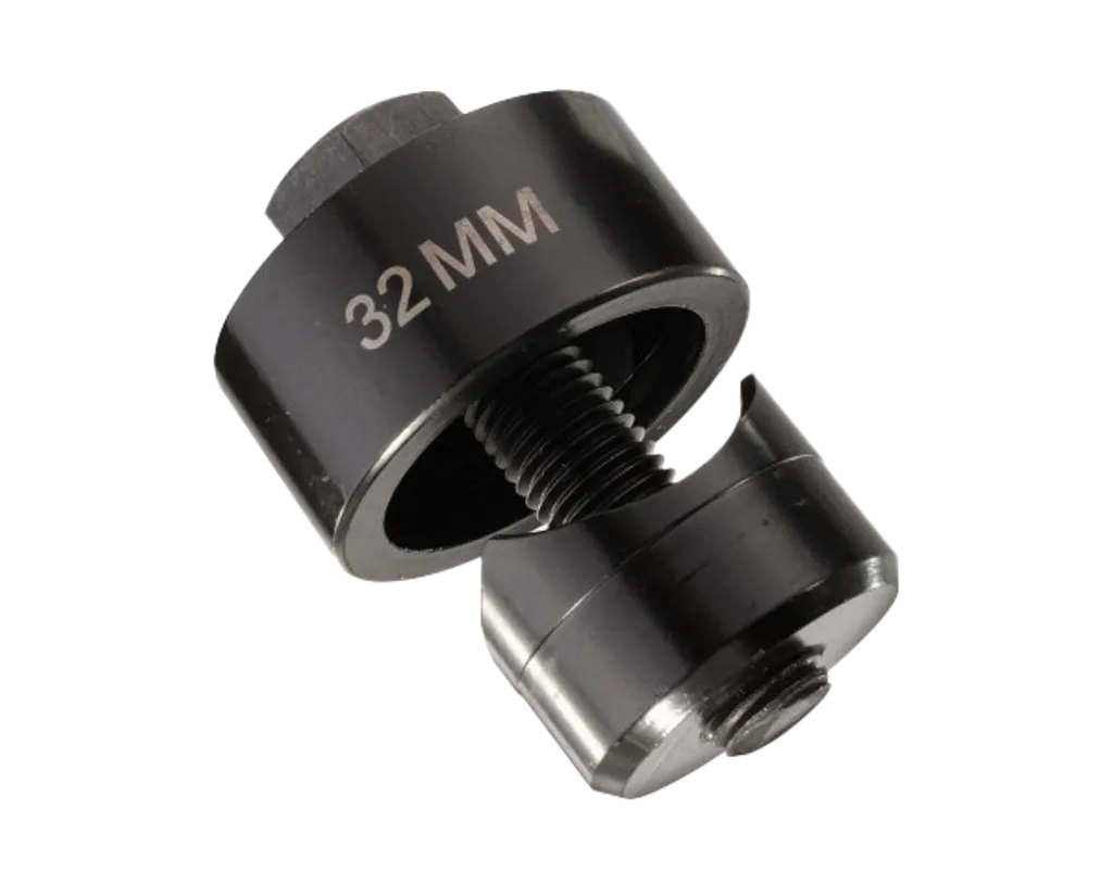 Stansen levererar rena hål i dimensionerna 32 mm och 35 mm och kan användas manuellt med standardnyckel eller tillsammans med hydraulisk press. Den robusta konstruktionen i härdat stål gör verktyget slitstarkt och tillförlitligt även vid upprepade arbeten.