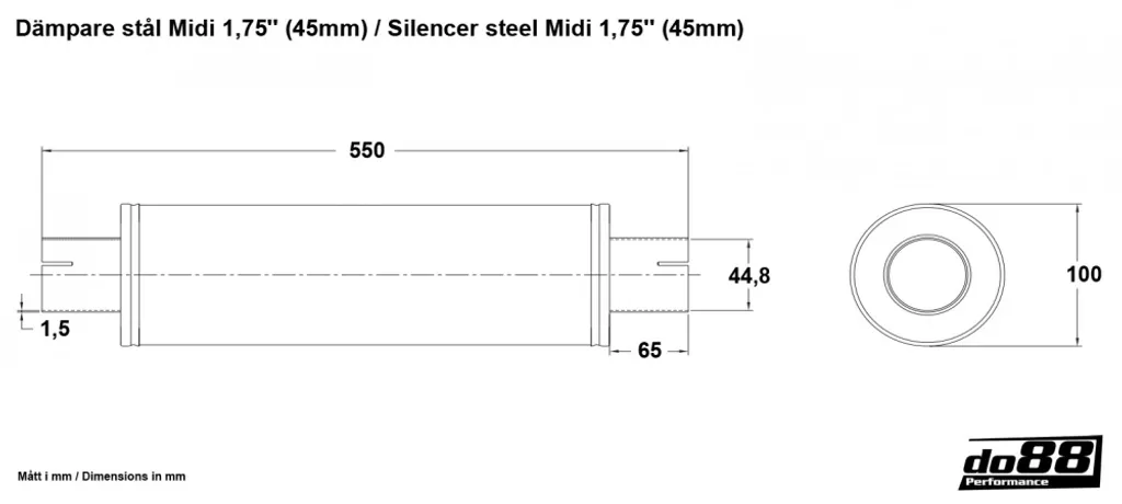 Ljuddämpare i svartlackerat aluminiserat stål med 1,75" (45 mm) anslutningar. En universell dämpare byggd enligt absorptionsprincipen för effektiv ljuddämpning med minimalt mottryck. Lämplig för sport, racing och anpassade avgassystem till de flesta fordon.