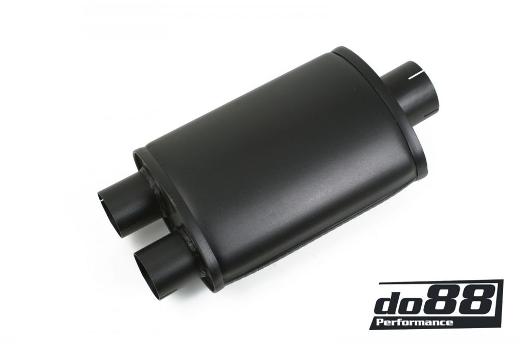 Universalljuddämpare i svartlackerat aluminiserat stål med delad anslutning 2,5 / 3" (63/76 mm). En robust och effektiv dämpare som är idealisk för dig som bygger eller modifierar avgassystem med grenrörslösning eller dubbel utgång.