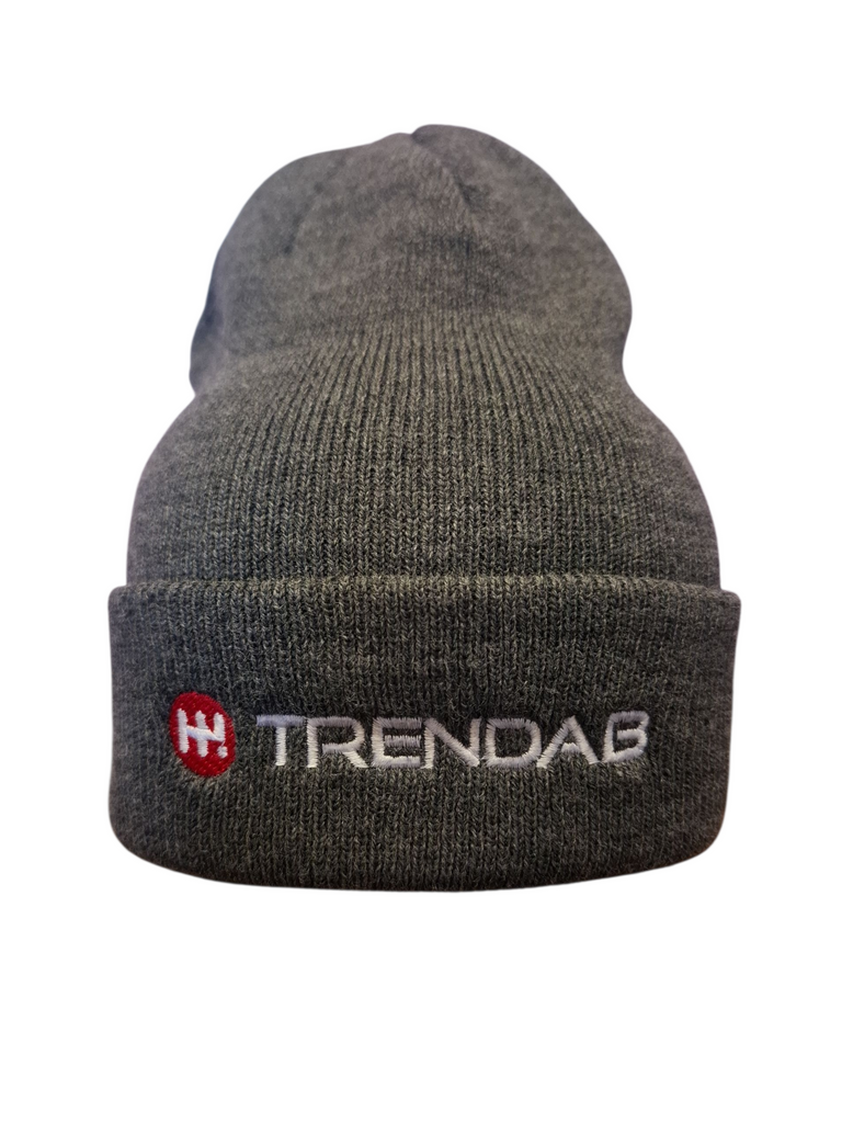 Snygg och skön gråmelerad stickad mössa med broderad Trendab-logotyp – en varm och slitstark mössa som passar både till arbete och fritid.