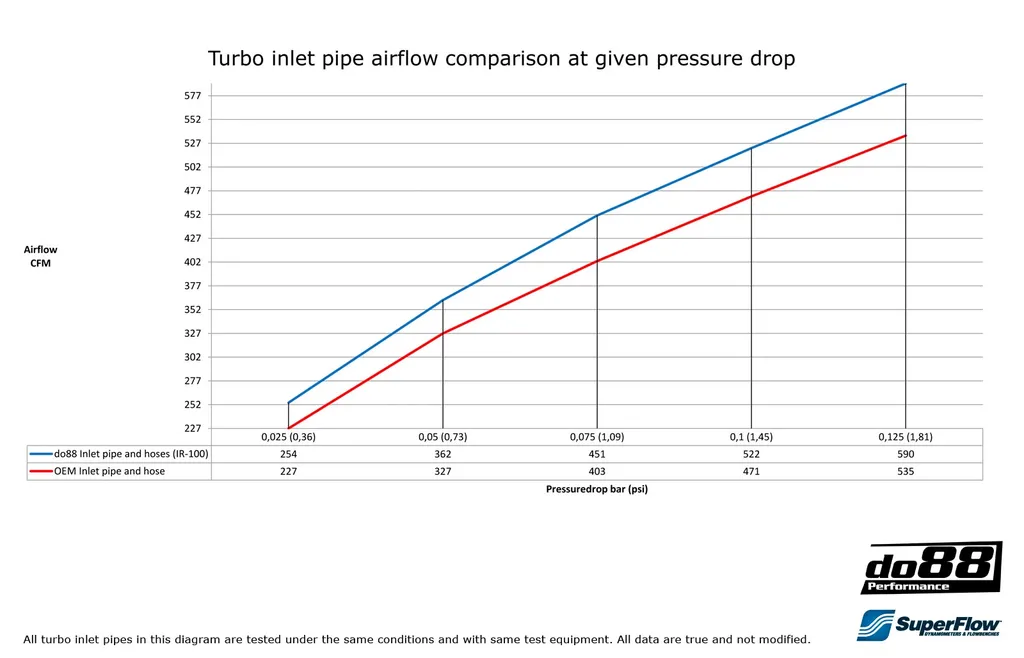 Vid 0,125 bar tryckfall uppmäts ett luftflöde på 590 CFM – att jämföra med originalrörets 535 CFM. Det innebär cirka 10 % bättre flöde och en märkbar förbättring i respons, spool och motoreffektivitet, särskilt vid höjd laddtrycksnivå.