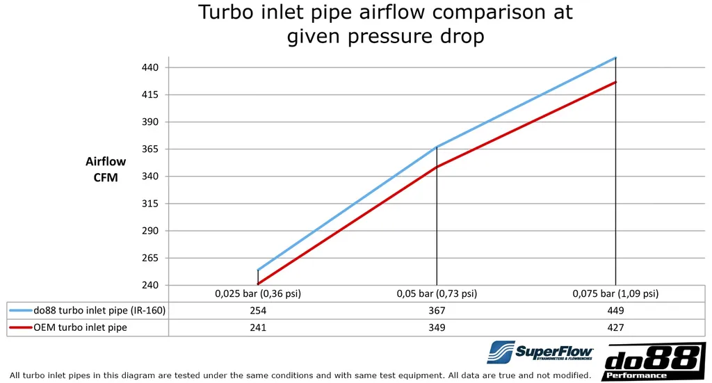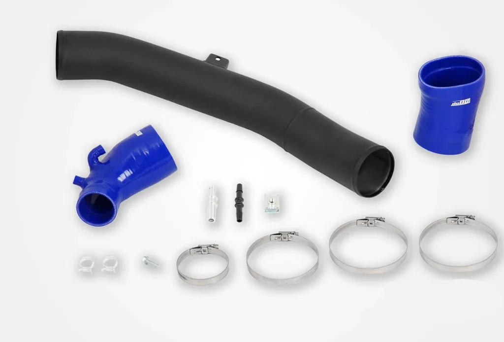 Inloppsröret har en ytterdiameter på 89 mm (3,5") och är tillverkat av extruderat aluminium som dornbockats i ett stycke för optimal form och jämn insida. De specialdesignade silikonslangarna i Blå färg har fyra lager polyesterarmering samt invändig stålwire som motverkar deformation vid undertryck. Den robusta konstruktionen klarar både höga temperaturer och hård belastning, vilket gör systemet perfekt för både gat- och banbruk.