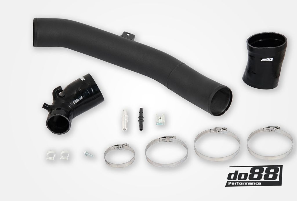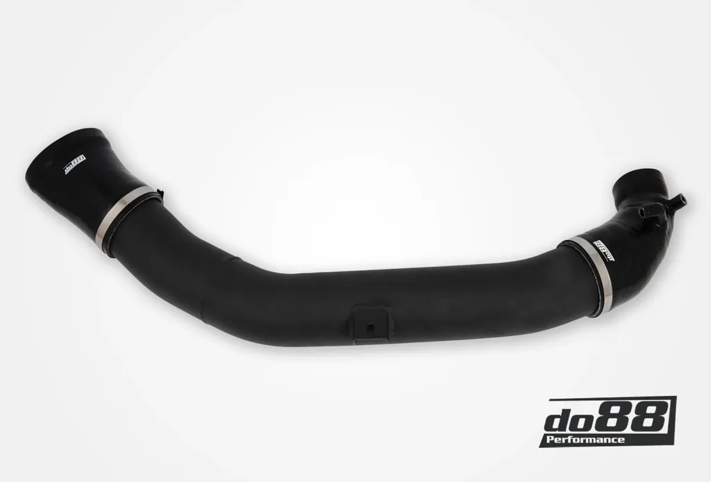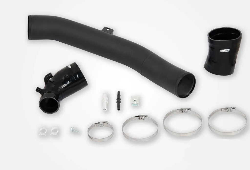 Inloppsröret har en ytterdiameter på 89 mm (3,5") och är tillverkat av extruderat aluminiumrör som dornbockats i ett stycke för perfekt passform och slät insida. Silikonslangarna är specialdesignade med fyra lager polyesterarmering och invändig stålwire, vilket ger hög hållfasthet och tålighet mot både undertryck och höga temperaturer. Konstruktionen bidrar till ökat luftflöde jämfört med originalröret och ger motorn bättre syretillförsel vid högt laddtryck.