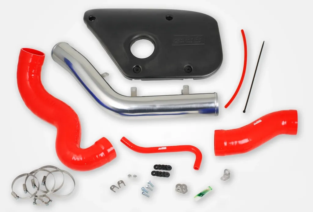 Originalröret mellan luftfilter och turboinlopp har en begränsad diameter och en intern resonator som skapar onödigt flödesmotstånd. Detta inloppsrör har en ytterdiameter på 76 mm (3") genom hela längden och en slät invändig yta som minimerar turbulens. Resultatet är ett markant förbättrat luftflöde till turbon, vilket ger snabbare gasrespons och ökad motoreffektivitet. Röret är tillverkat av extruderat aluminium som dornbockats i ett stycke för optimal passform och hållbarhet. De medföljande silikonslangarna är tillverkade med fyra lager polyesterarmering och invändig stålwire, vilket ger maximal styrka och värmetålighet.