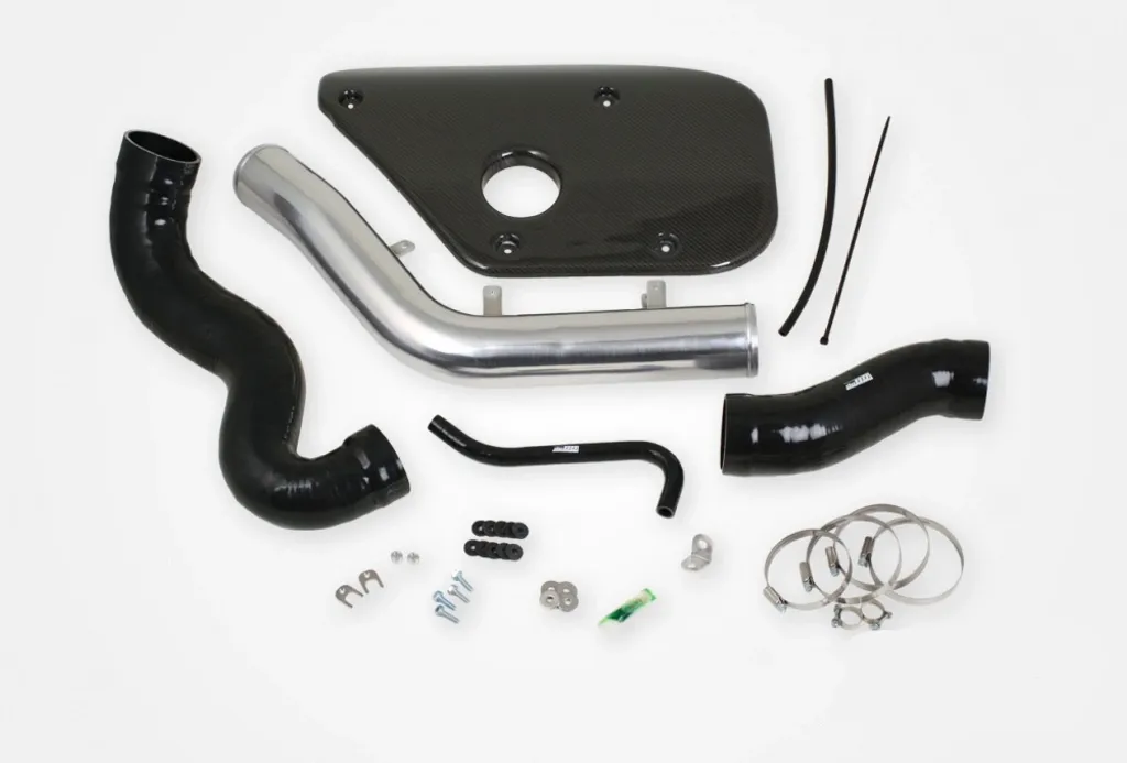 Originalröret mellan luftfilter och turboinlopp har en begränsad diameter och en intern resonator som skapar onödigt flödesmotstånd. Detta inloppsrör har en ytterdiameter på 76 mm (3") genom hela längden och en slät invändig yta som minimerar turbulens. Resultatet är ett markant förbättrat luftflöde till turbon, vilket ger snabbare gasrespons, bättre motoreffektivitet och högre prestanda. Röret är tillverkat av extruderat aluminium som dornbockats i ett stycke för optimal passform och hållbarhet. De medföljande silikonslangarna är tillverkade med fyra lager polyesterarmering och invändig stålwire för maximal styrka, värmetålighet och livslängd.