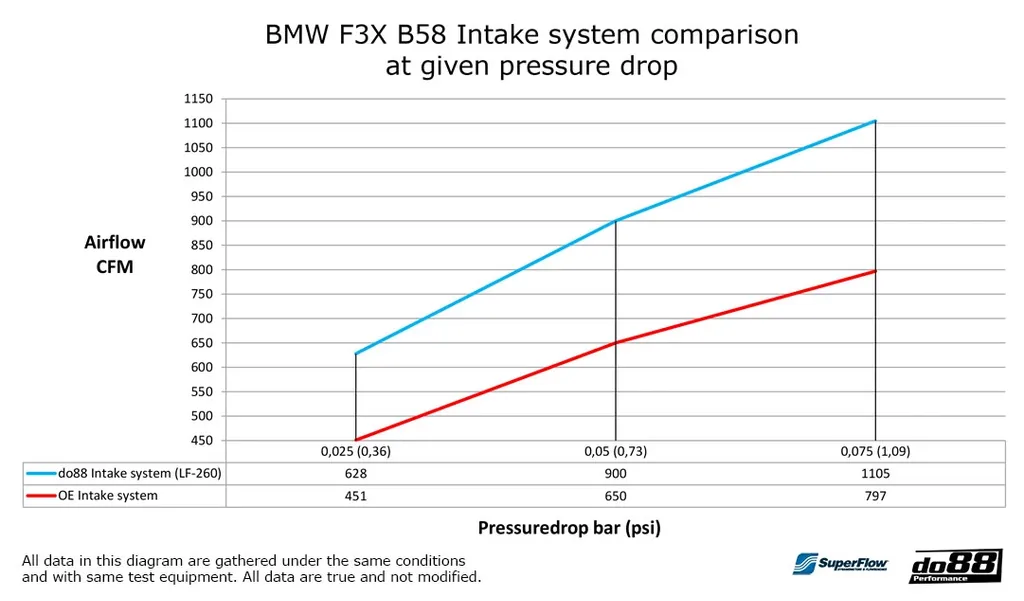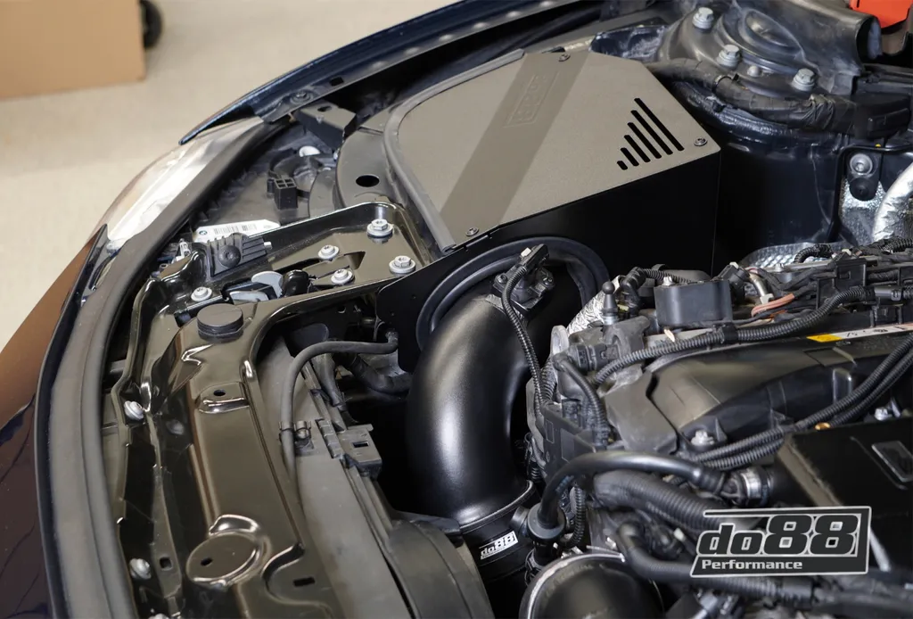 Systemet har en helt sluten design som förhindrar att varm luft från motorrummet påverkar lufttillförseln. Denna konstruktion säkerställer att motorn alltid får kall, syrerik luft – vilket ger bättre laddtryck, förbättrad gasrespons och högre effektpotential. Insugssystemet är noggrant optimerat för B58-motorn och använder ett specialanpassat aluminiumrör med exakt innerdiameter för att bibehålla korrekta mätvärden från luftmassemätaren.