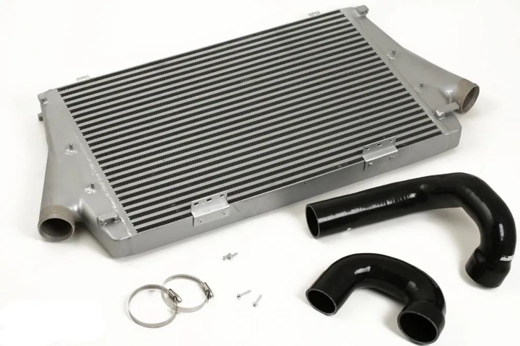Intercoolern har 2,5" (63 mm) slanganslutningar istället för originalets 2,25" (57 mm) för förbättrat luftflöde och lägre mottryck. Två svarta silikonslangar för in- och utlopp medföljer. Alla fästen för vattenkylare, AC-kondensor och luftstyrning är integrerade, vilket gör installationen enkel och exakt i bilens originalinfästningar.