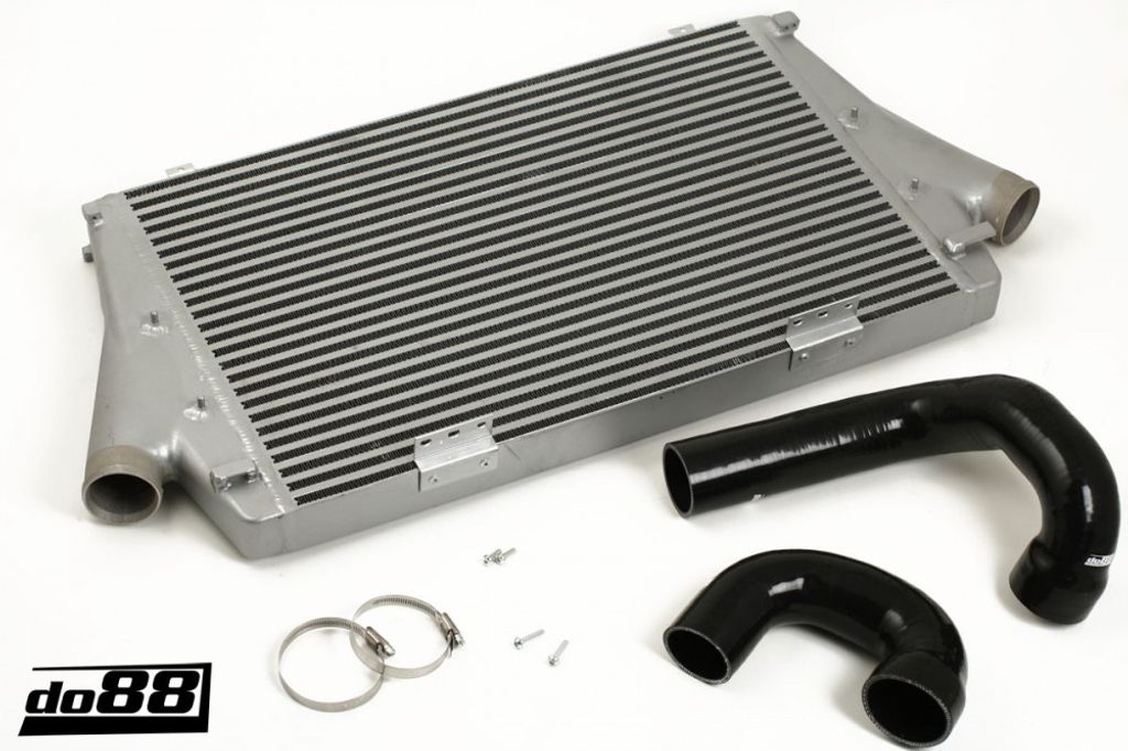 Intercoolern har 2,5" (63 mm) slanganslutningar istället för originalets 2,25" (57 mm), vilket ger bättre flöde och lägre mottryck. Ett komplett kit med två svarta silikonslangar för in- och utlopp medföljer. Alla fästen för vattenkylare, AC-kondensor och luftstyrning är integrerade, vilket gör installationen snabb och smidig. Monteras direkt i originalfästen.