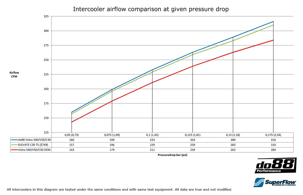 Högpresterande intercooler för Volvo C30, S40, V50 och C70 Turbo (04–13) som ersätter originalkylaren och ger markant förbättrad kylförmåga, högre effekt och ökad driftsäkerhet. Designad för enkel montering utan behov av modifiering.