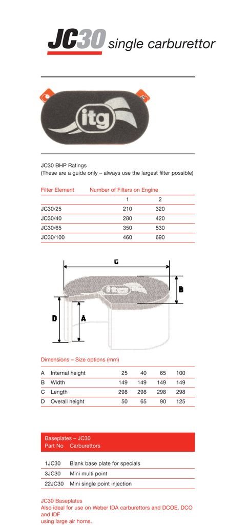 ITG JC30 basplattan är framtagen för att ge en säker, tät och långvarig montering av JC30 skumluftfilter. Konstruktionen i pulverlackerat stål ger hög slitstyrka och motstånd mot korrosion, medan oborrade varianter i dural aluminium erbjuder extra stabilitet under hård belastning och vid höga temperaturer. Levereras komplett med clips för enkel och pålitlig installation.
