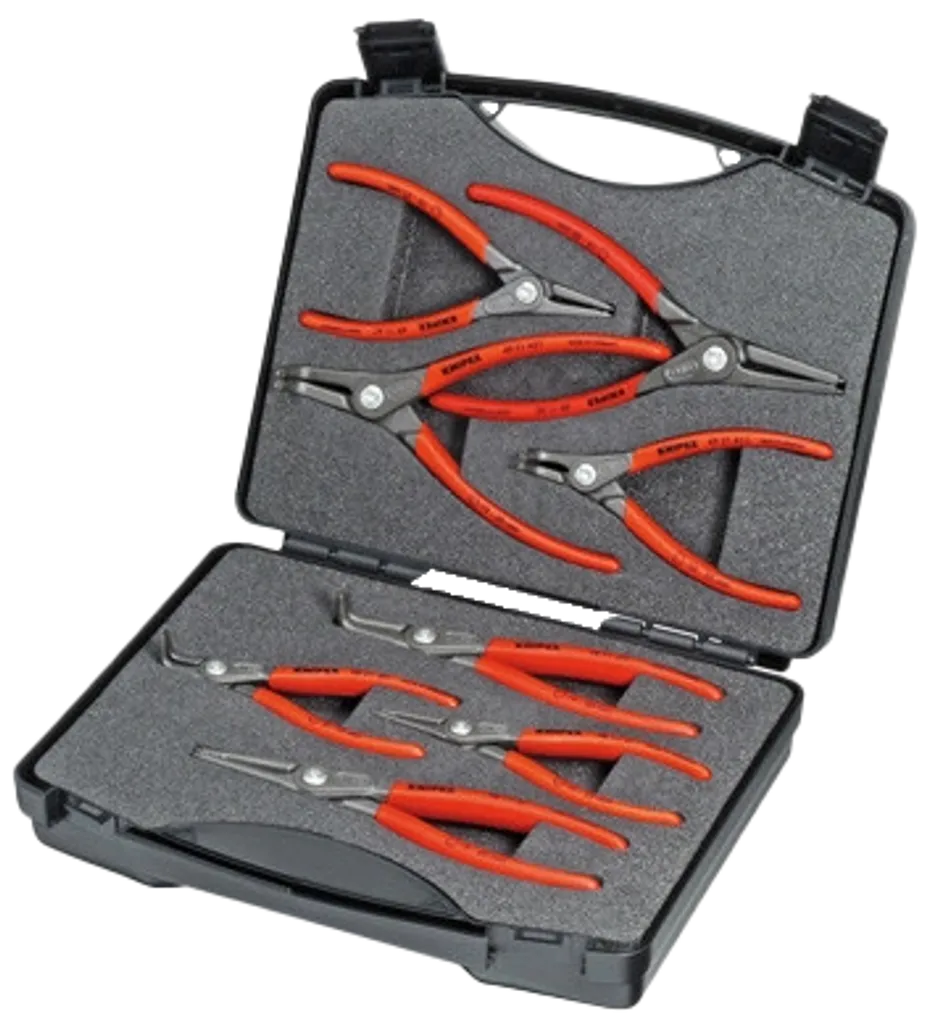 KNIPEX 00 21 25 är en mångsidig låsringstångsats för både inner- och ytterringar. Med åtta precisionsverktyg täcks de vanligaste dimensionerna och spetsutförandena – från raka till 90° böjda spetsar. Setet levereras i en robust plastväska med formskuret skuminlägg som ger tydlig placering, skydd och enkel åtkomst till varje verktyg.