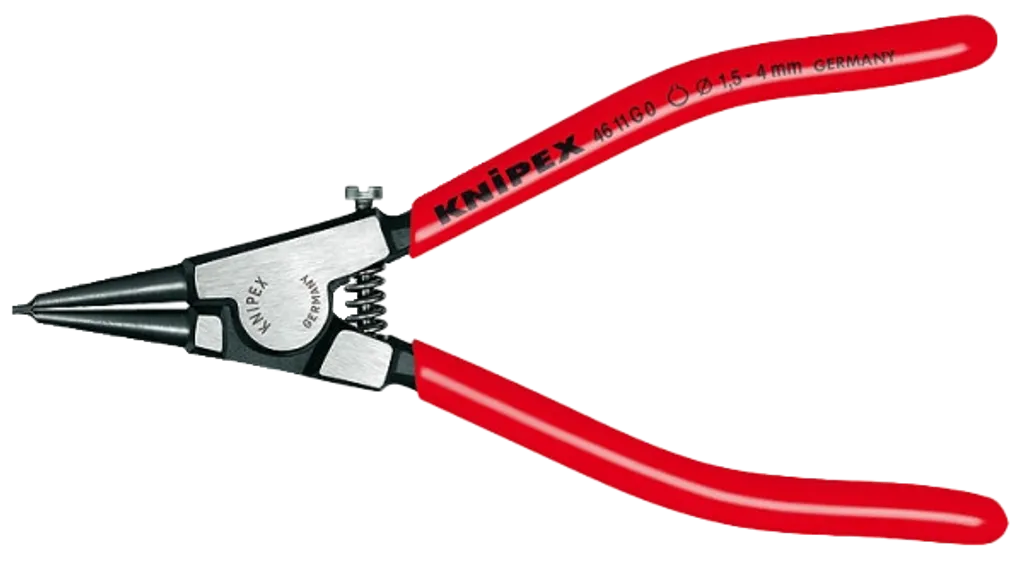 KNIPEX 46 11 G0 är en kompakt och smidd låsringstång, särskilt framtagen för montering av gripringar på axlar med diameter Ø 1,5–4 mm. Med solida raka spetsar, öppningsfjäder och en justerbar begränsningsskruv säkerställs stabil hantering utan risk för överexpansion eller deformation av ringen.