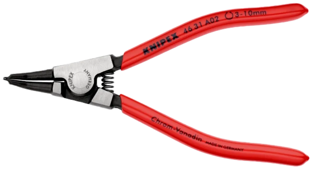KNIPEX 4631-serien är tillverkad i smitt specialstål och utrustad med 45° vinklade spetsar för säker och exakt styrning av låsringar. Den robusta konstruktionen och ergonomiska designen gör tången till ett pålitligt verktyg för både finmekanik och tung industri.