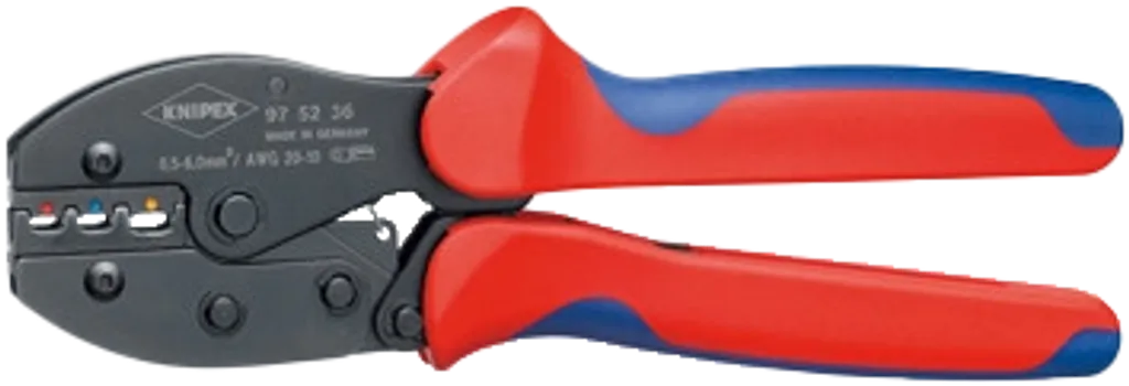 KNIPEX PreciForce® 97 52 36 är konstruerad för pålitlig crimpning av isolerade kabelskor i ledarareor mellan 0,5–6,0 mm². Den har tre exakta crimppositioner, fabriksinställt men justerbart presstryck och en kraftförstärkande vinkelled som minskar belastningen på användaren. Med sin kompakta form, låga vikt och ergonomiska flerkomponentshandtag är den ett idealiskt verktyg för daglig proffsanvändning.