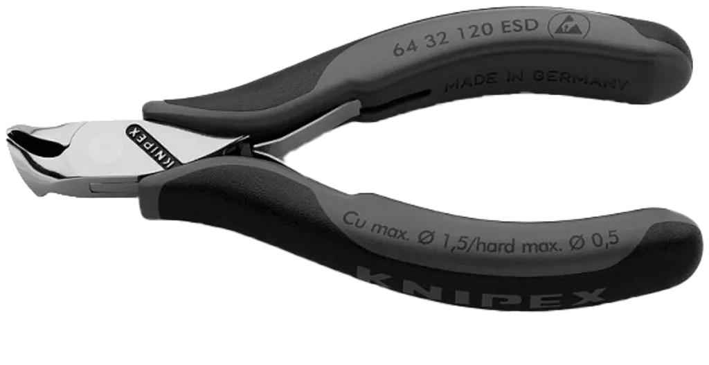 KNIPEX Ändavbitare ESD 120 mm är en snedställd precisionsavbitare med elektrostatiskt avledande handtag, särskilt utvecklad för arbete i ESD-skyddade miljöer.