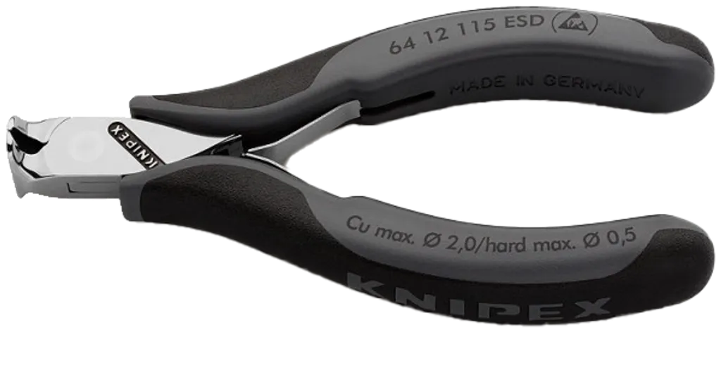 KNIPEX Ändavbitare med fjäder 115 mm ESD kombinerar säkerhet, precision och ergonomi – ett oumbärligt verktyg för elektronik och finmekaniska arbeten i ESD-skyddade miljöer.
