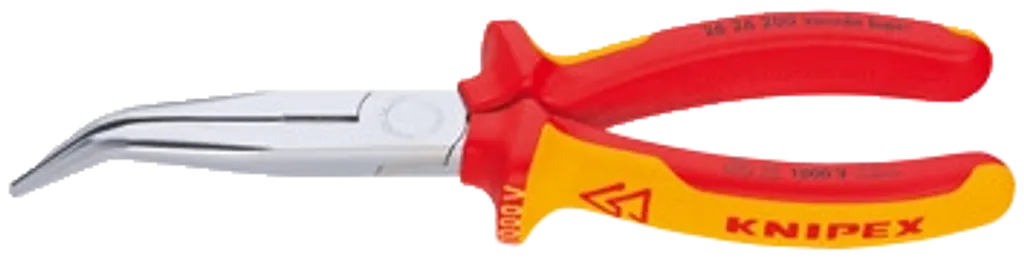 KNIPEX Flacktång vinklad 1000V 200 mm är en robust och säker precisionsflacktång med 40° vinklade käftar – VDE-godkänd för arbete upp till 1000V och utrustad med en integrerad isolerad ögla för fallskydd.