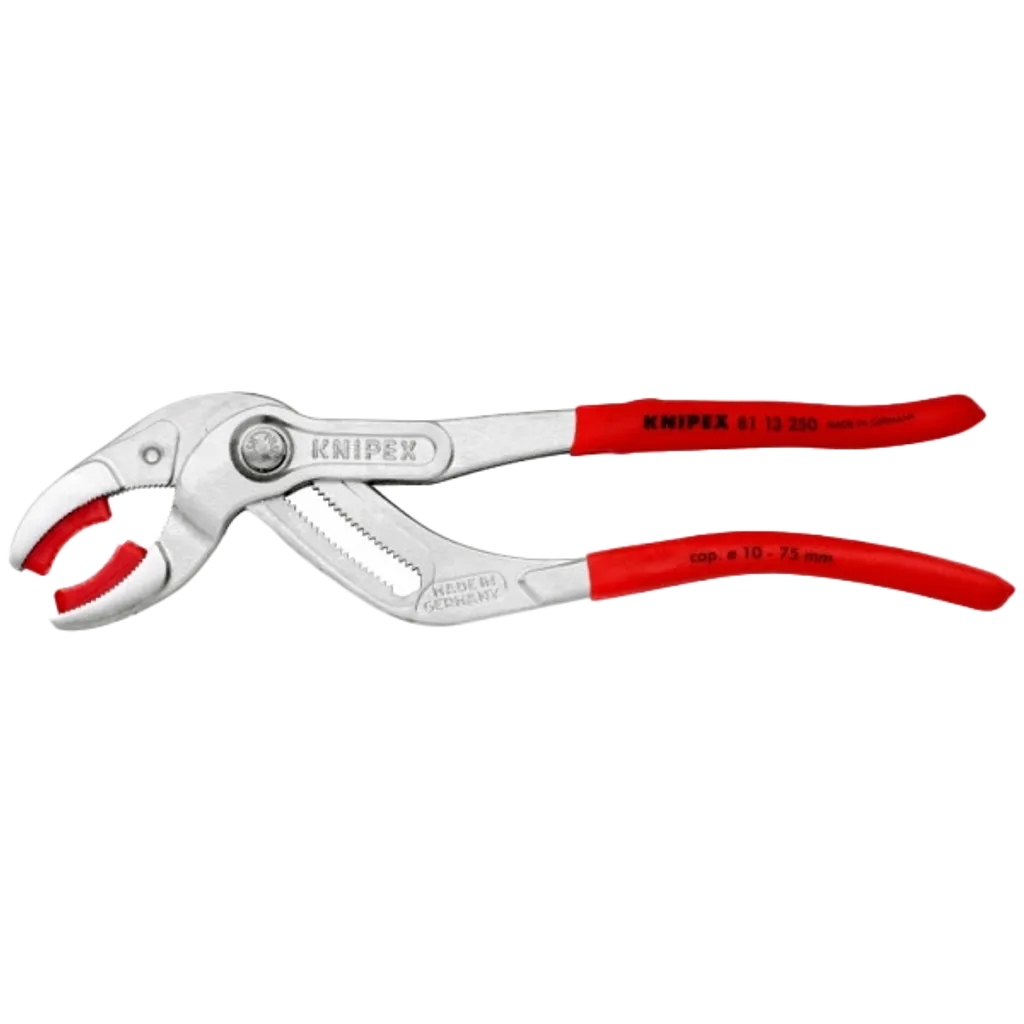 KNIPEX Griptång 8113250 är en mångsidig och skonsam lösning för både VVS-installationer och industriservice. Med 25 inställningslägen och utbytbara käftar i tvåkomponents plastmaterial (mjuk och hård zon) ger tången ett fast grepp utan att skada ömtåliga ytor. Den slanka designen, ergonomiska skänkelgeometrin och kapacitet upp till 75 mm gör den idealisk för arbete i både verkstad och servicebil.
