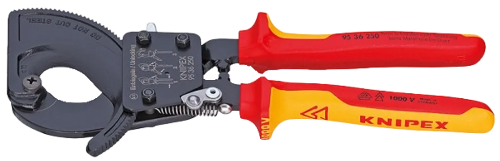 KNIPEX 95 36 250 är en kraftfull VDE-godkänd kabelavbitare för Cu- och Al-kablar upp till 240 mm² – utrustad med spärrfunktion och tvåväxlad kugghjulsdrift för enkel enhandsmanövrering.