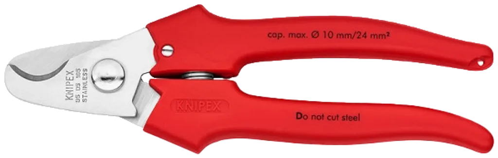 KNIPEX 95 05 165 är en kompakt enhandskabelsax för Cu- och Al-kablar upp till Ø 10 mm / 24 mm².