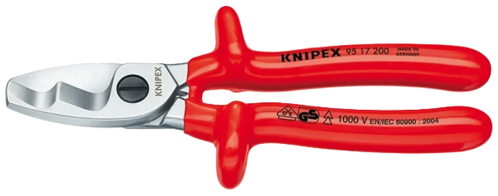 KNIPEX 95 17 200 är en VDE-godkänd enhandskabelsax för Cu- och Al-kablar – konstruerad för säker kapning upp till Ø 20 mm.