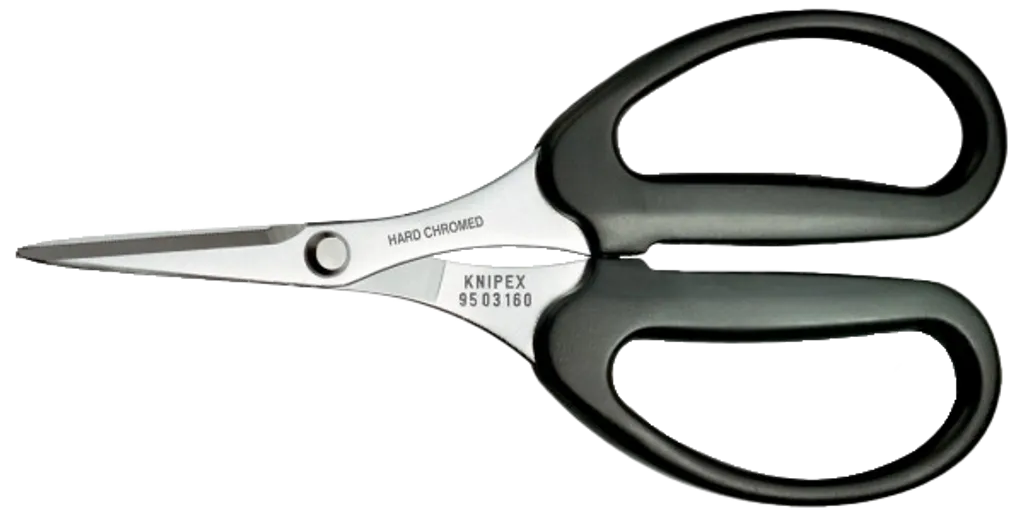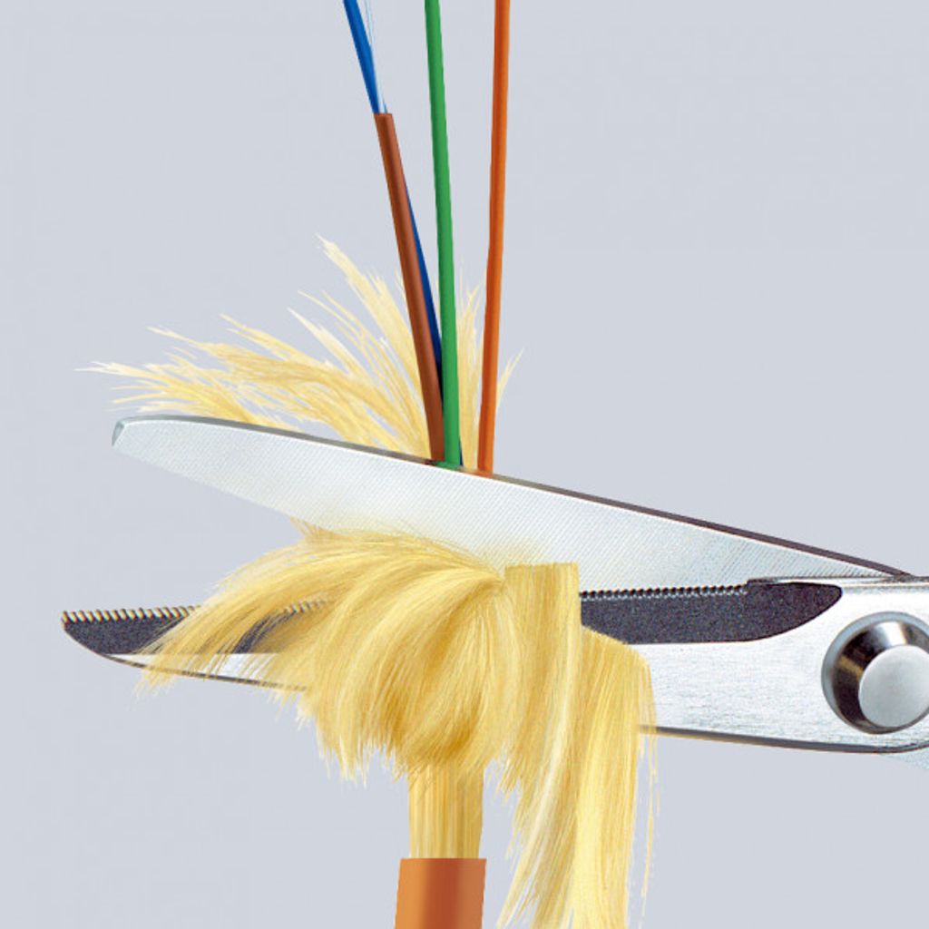KNIPEX 95 03 160 SB är en specialdesignad sax för kapning av KEVLAR®-fiber i fiberoptiska kablar – med tandad slipning som säkerställer exakta snitt utan glidning.