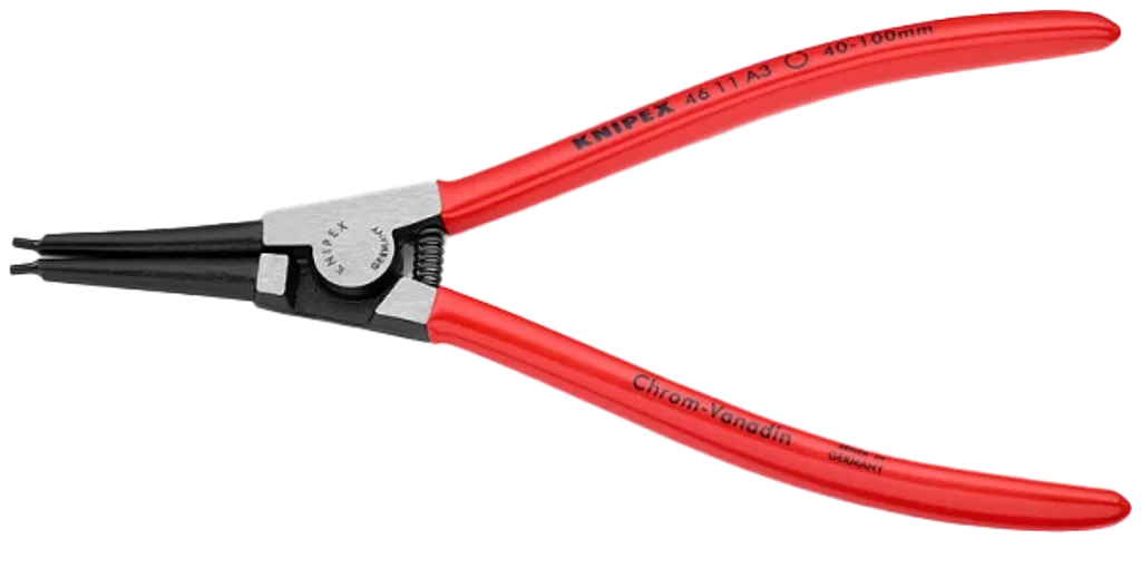 KNIPEX Låsringstång 40-100mm Utv SB-pack är en kraftig och smidd tång med raka, solida spetsar – utvecklad för säker montering av utvändiga låsringar på axlar med diameter Ø 40–100 mm.