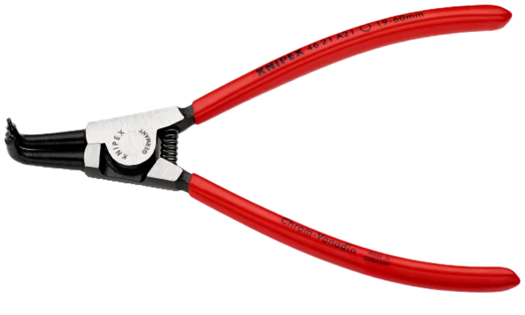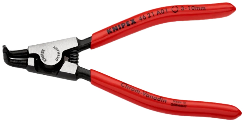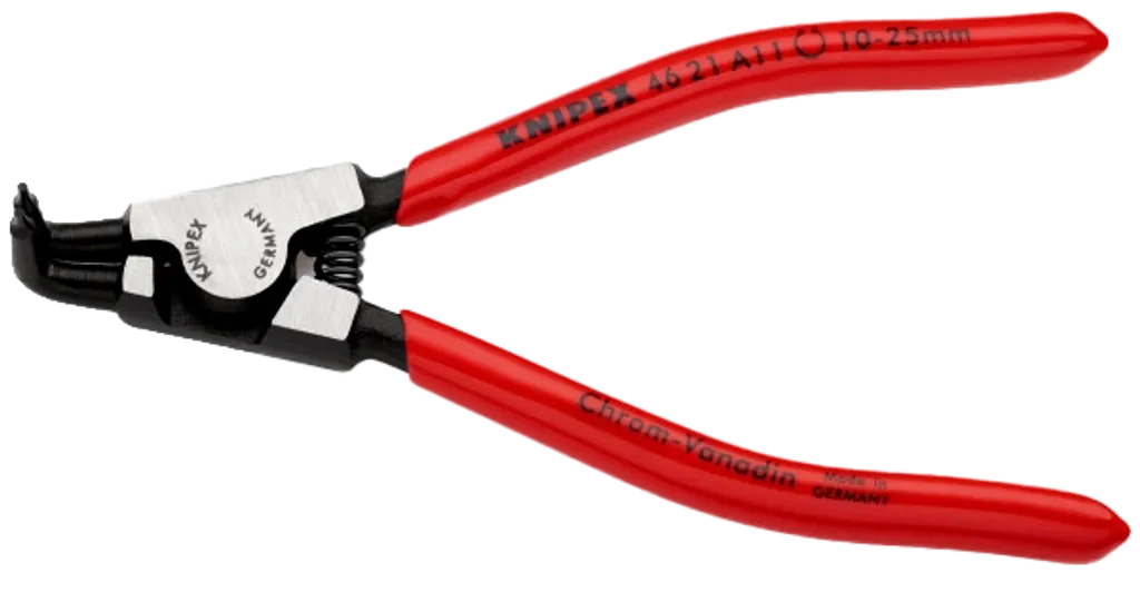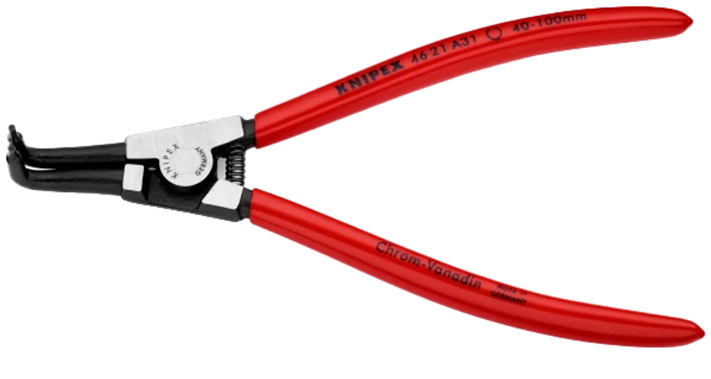 KNIPEX 4621 är den professionella lösningen för säker montering av utvändiga låsringar på axlar, även i trånga utrymmen där raka tänger inte räcker till.